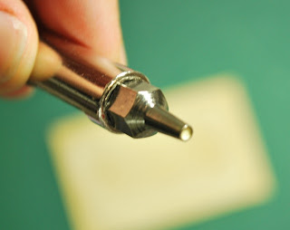 Bata com o martelo quantas vezes achar necessário. O importante é que o furo esteja no papel quando retirar a ferramentas. Muitas vezes no começo, achamos que já batemos o suficiente e tiramos a ferramenta de sua posição inicial e quando olhamos o papel, o furo ainda não está lá. Como é difícil posicionar a ferramenta exatamente no mesmo local, pode acabar destorcendo um pouco o posicionamento inicialmente marcado, portanto tenha muito cuidado e certeza antes de tirar a ferramenta da posição inicial. Com o tempo você vai conhecendo melhor a ferramenta e adaptando a quantidade de força que é necessária para realizar o furo.