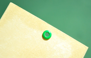 Agora com o papel perfurado, coloque o ilhós. A foto abaixo mostra o furo realizado e o ilhós encaixado (parte de frente e parte atrás do papel).